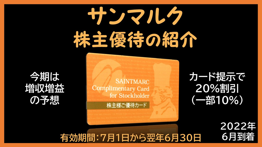 3月に権利確定する株式会社サンマルクホールディングス(証券コード:3395)の株主優待を紹介いたします。100株以上の保有で、10%もしくは20%の割引になる『株主様ご優待カード』が贈呈されます。株主優待は2022年6月に届きました。
